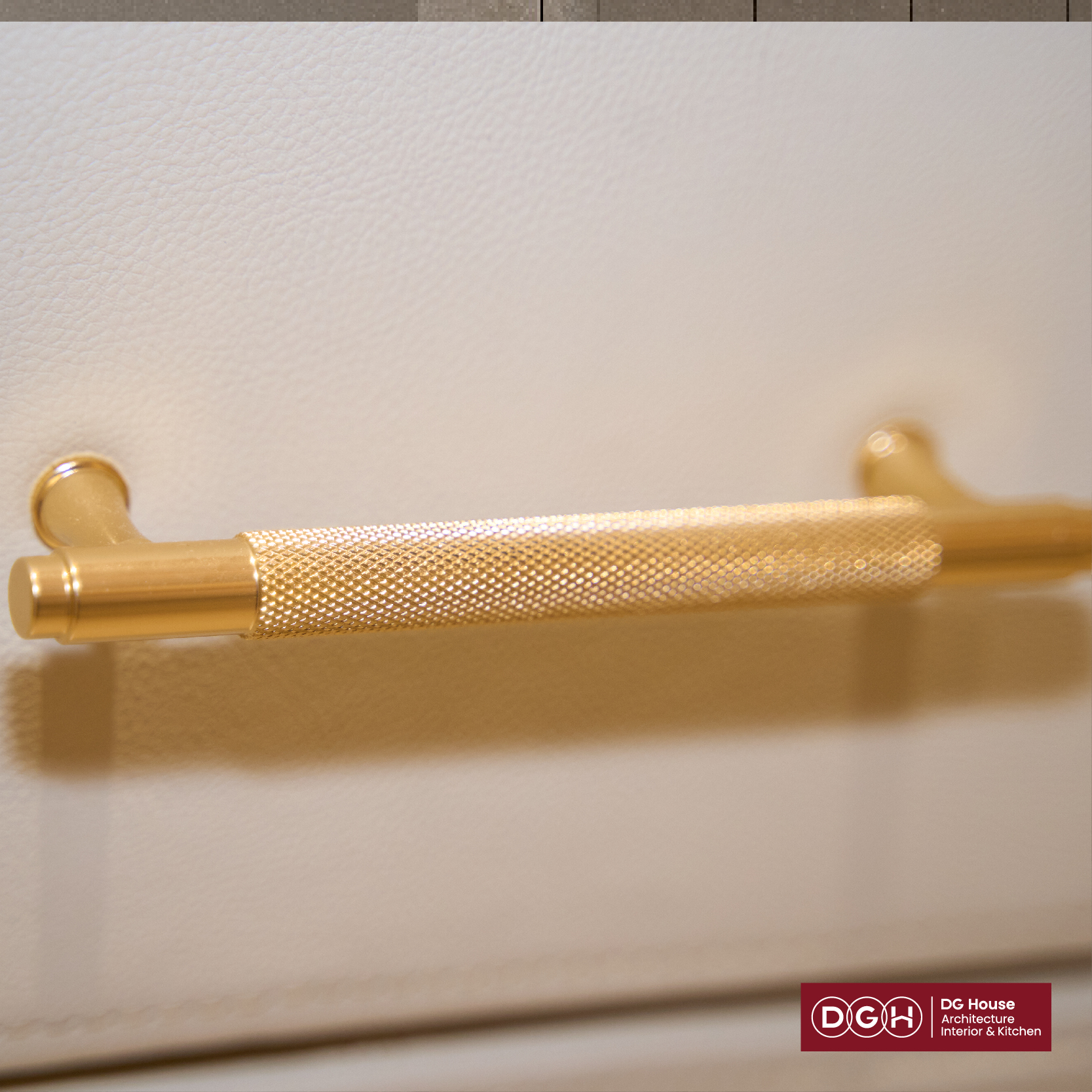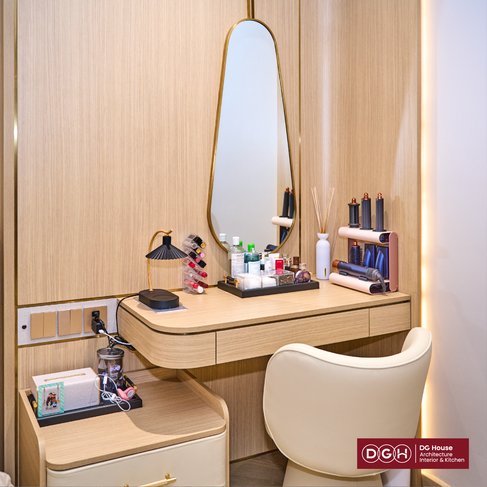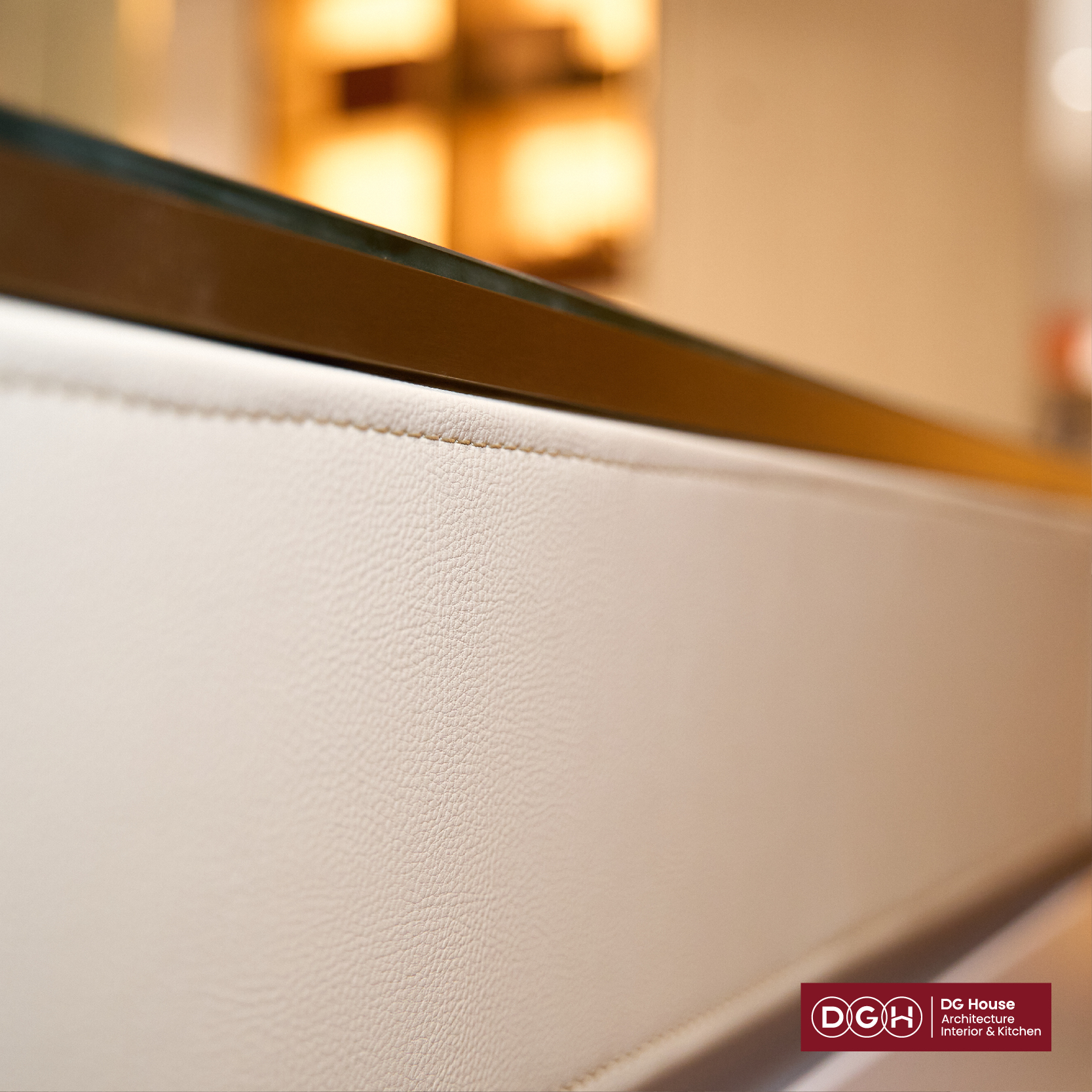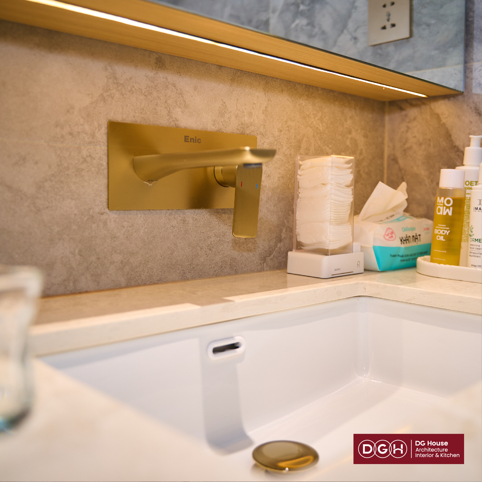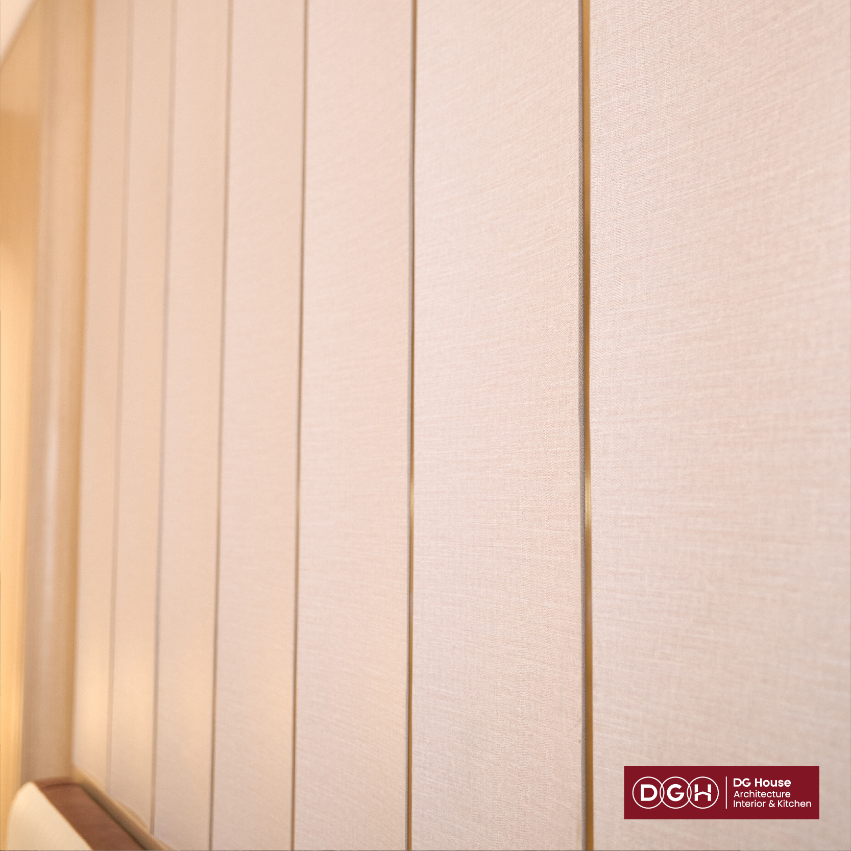 Màu sắc chủ đạo: Be, kem, gỗ sáng kết hợp nẹp đồng PVD.