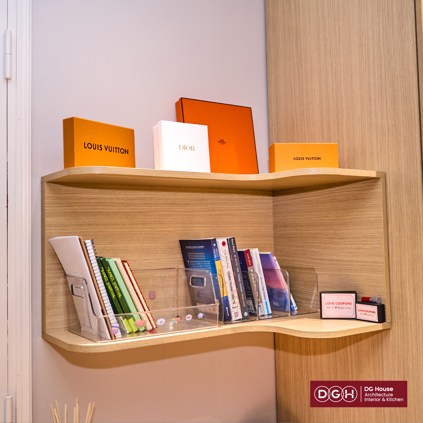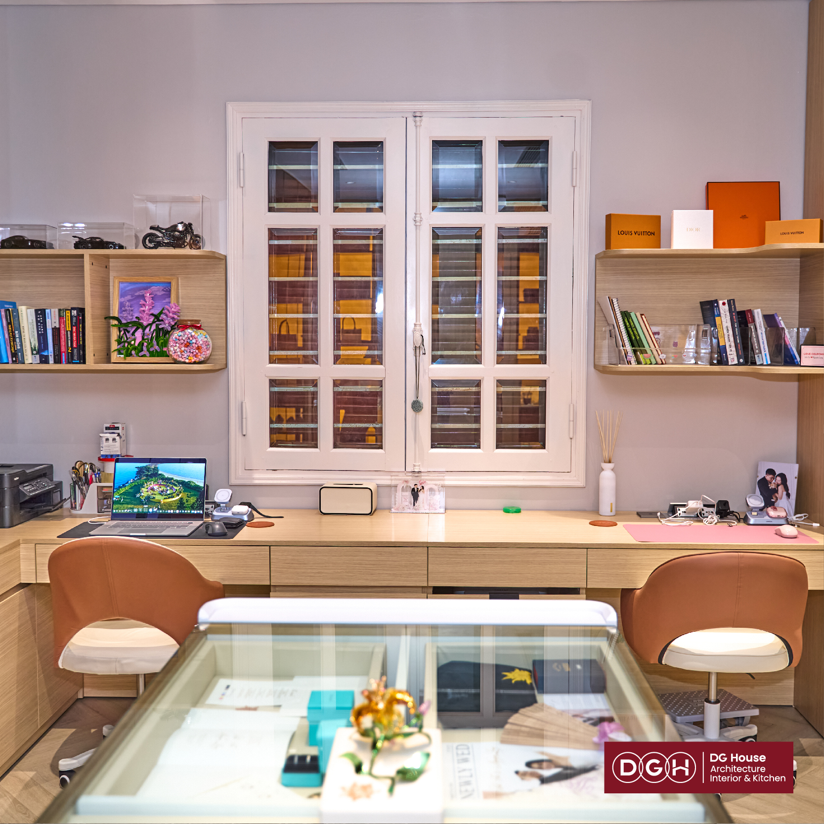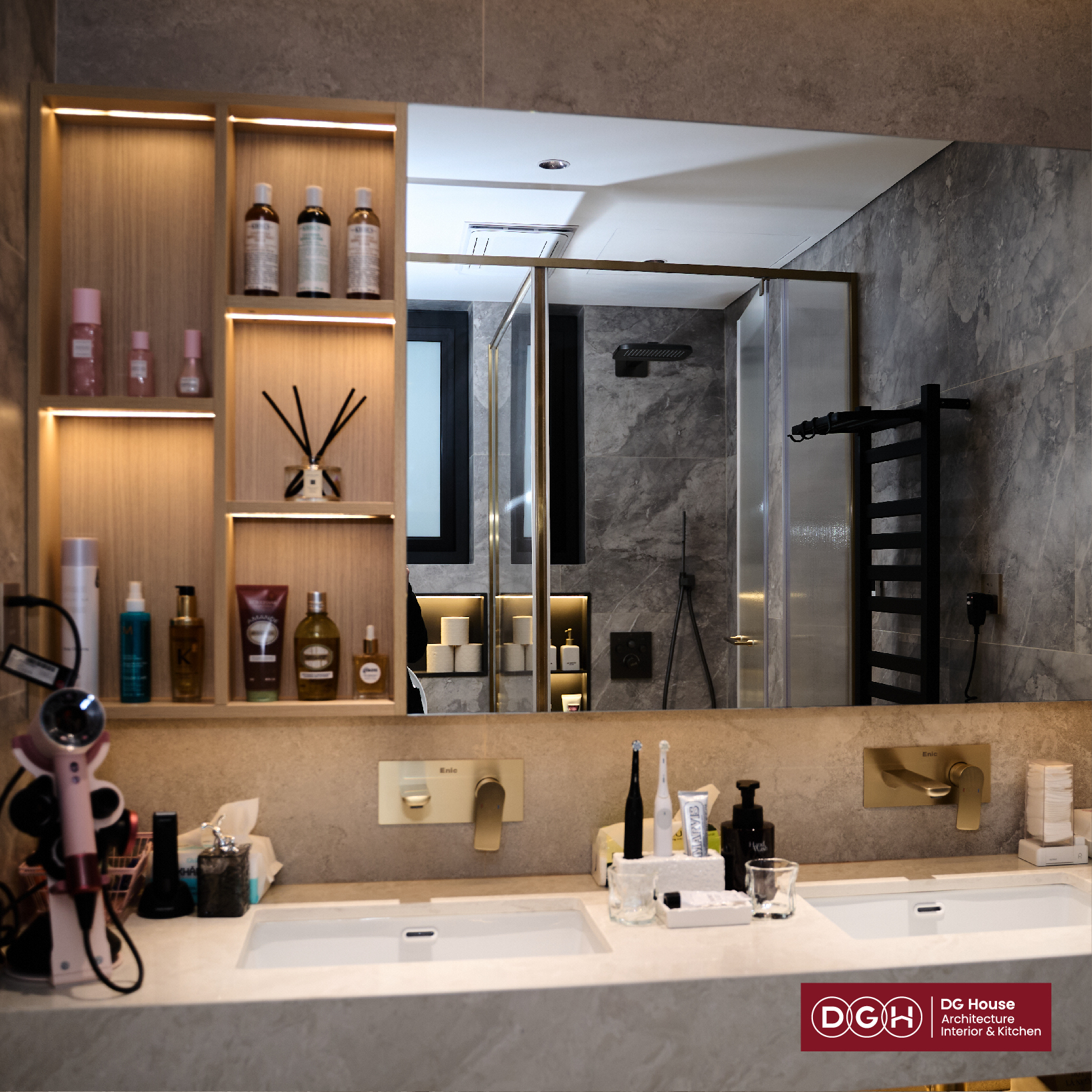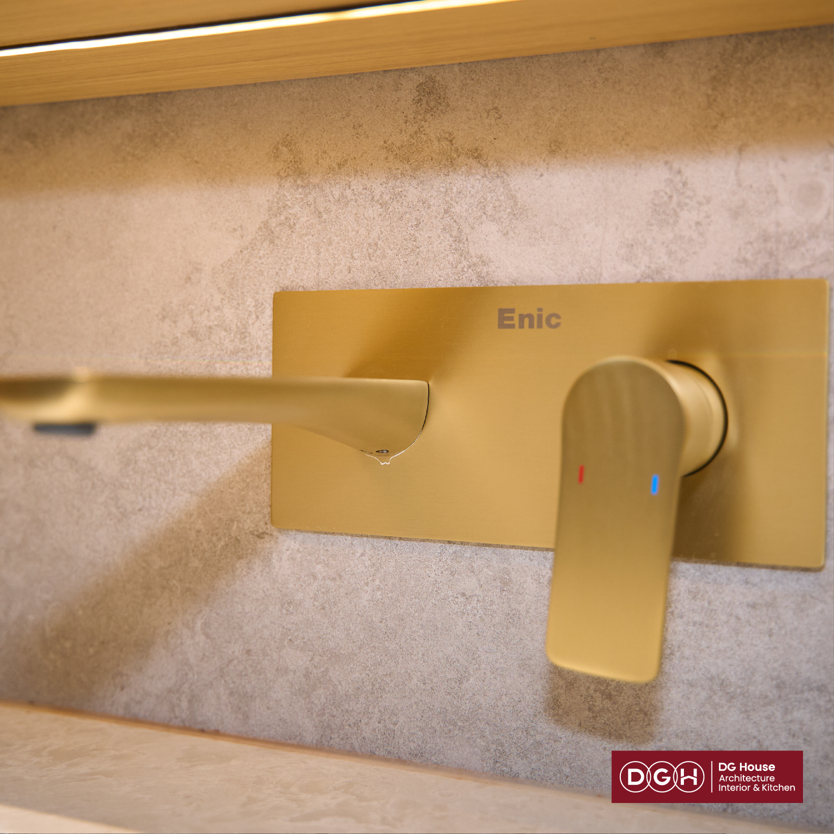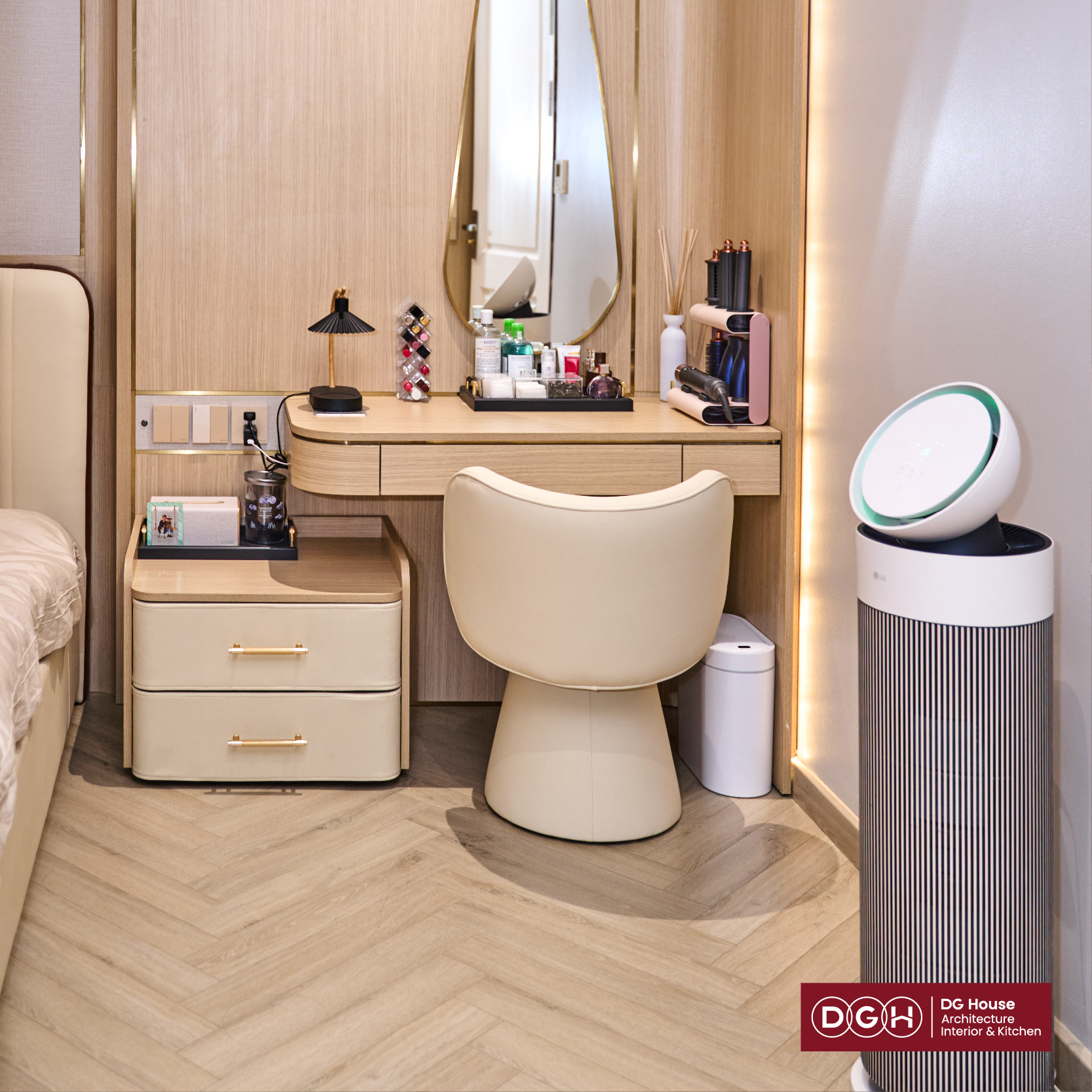 Màu sắc chủ đạo: Be, kem, gỗ sáng kết hợp nẹp đồng PVD.
