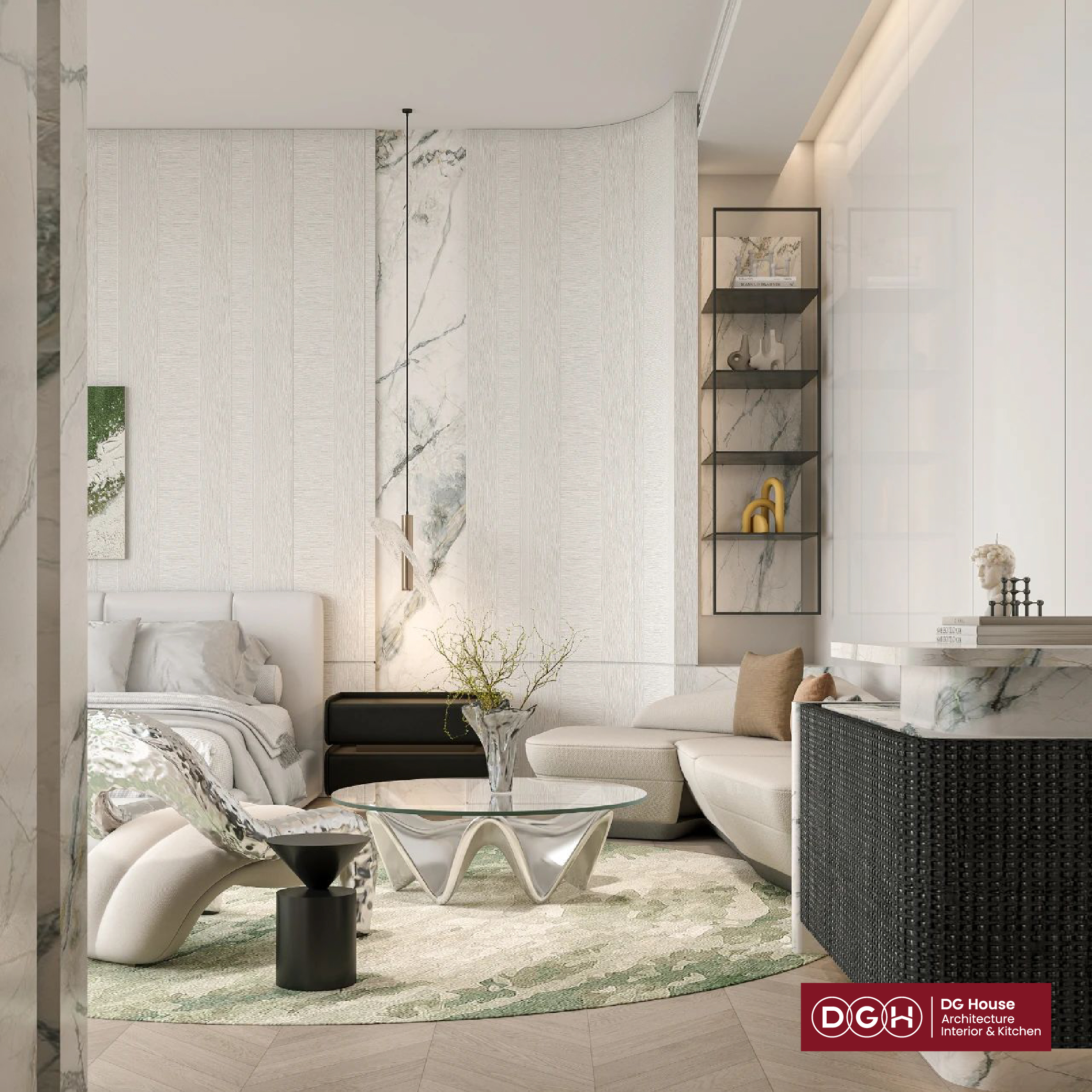 Điểm nhấn sang trọng: bàn trà, kệ tường, phụ kiện decor tối giản nhưng tinh xảo, gợi cảm giác cao cấp.