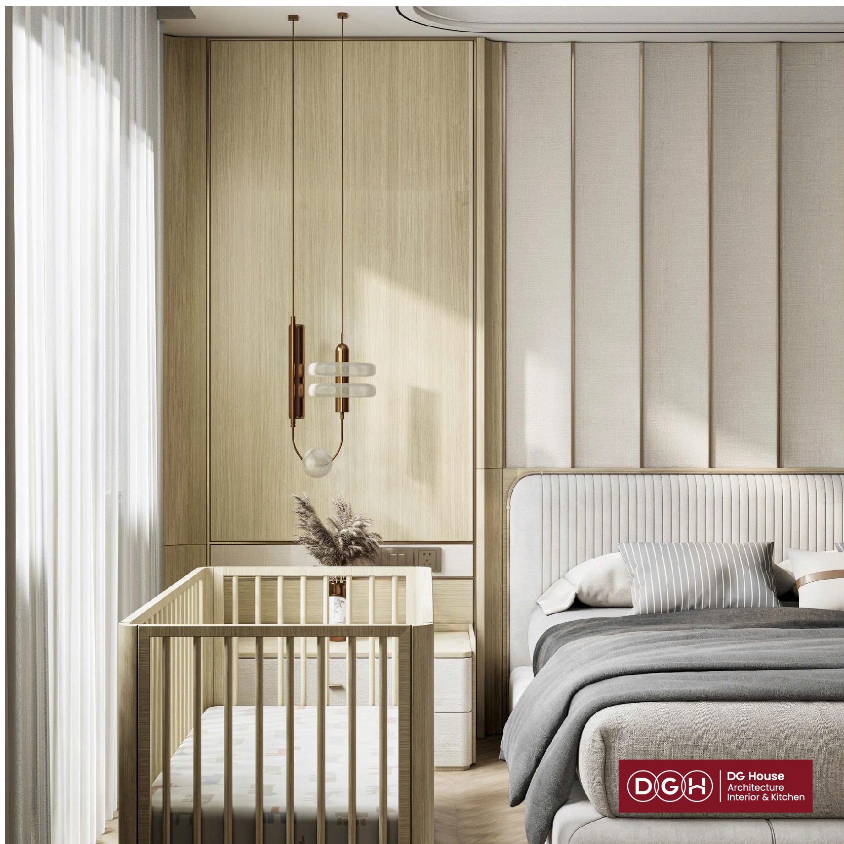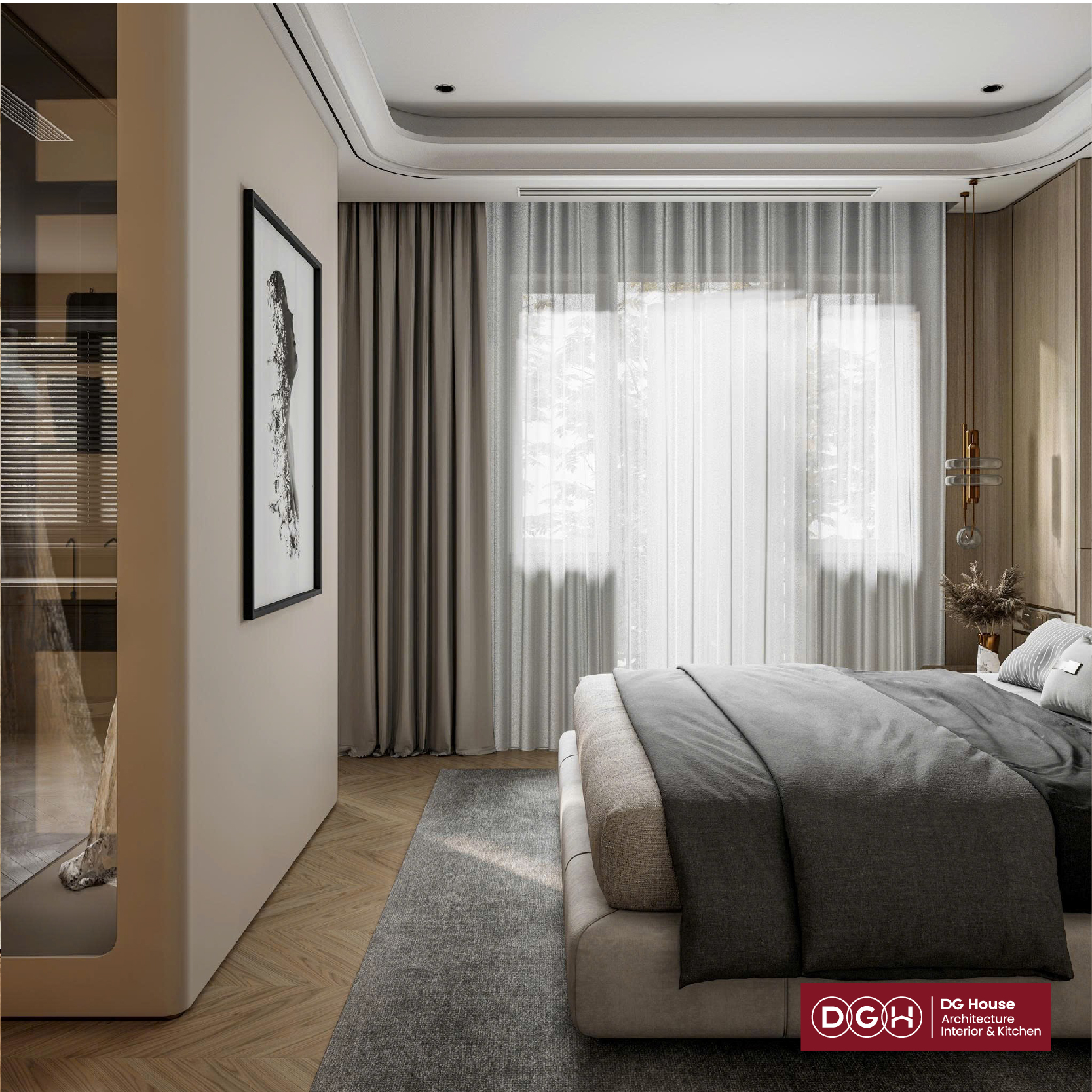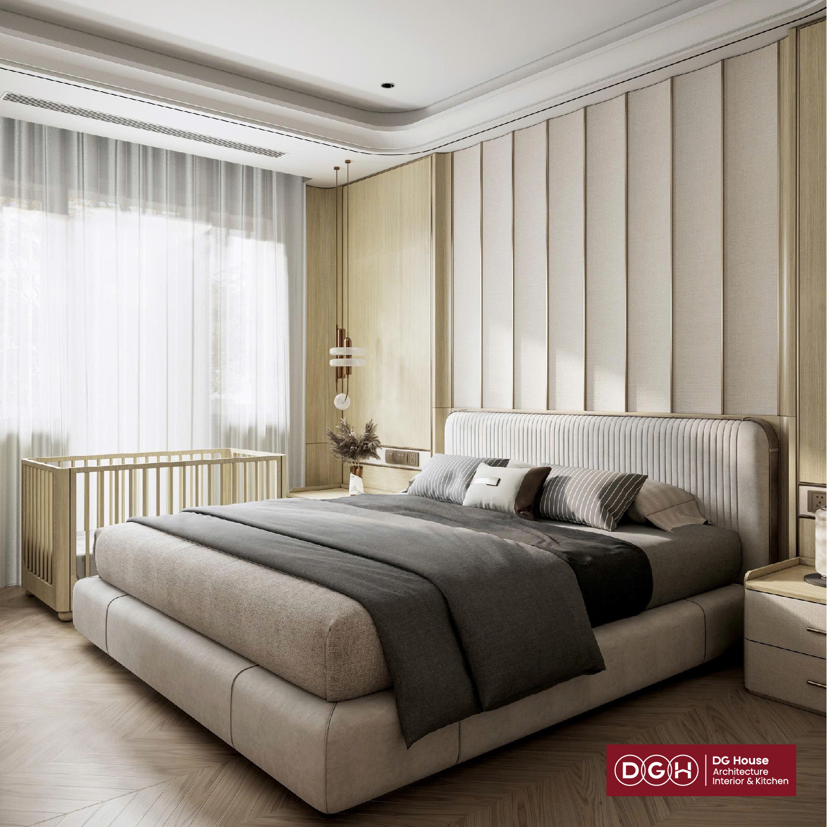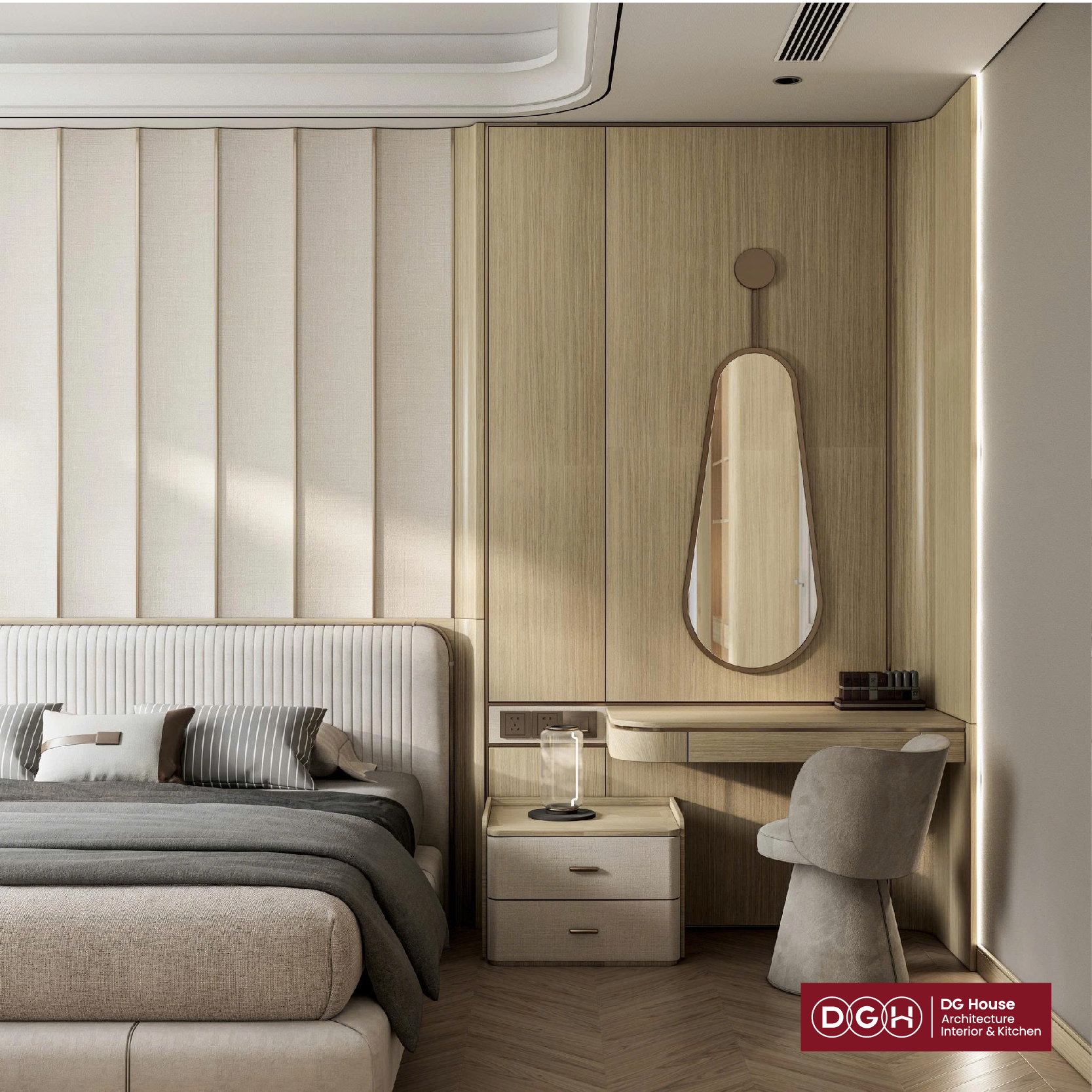 Giường ngủ được đặt tại trung tâm với vách đầu giường bọc nỉ cao cấp, kết hợp nan gỗ tạo điểm nhấn thị giác mạnh mẽ. Tone màu be và ghi sáng được ưu tiên để tạo cảm giác thư giãn, giúp gia chủ dễ dàng tái tạo năng lượng sau ngày làm việc.
