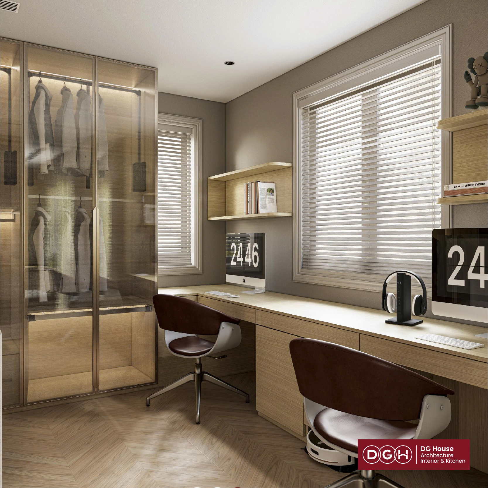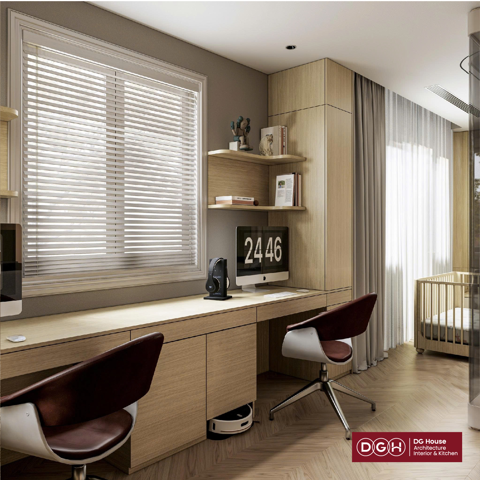 + Góc Làm Việc : Tận dụng tối đa ánh sáng tự nhiên từ cửa sổ lớn, kết hợp bàn làm việc treo tường tối giản để tiết kiệm diện tích.