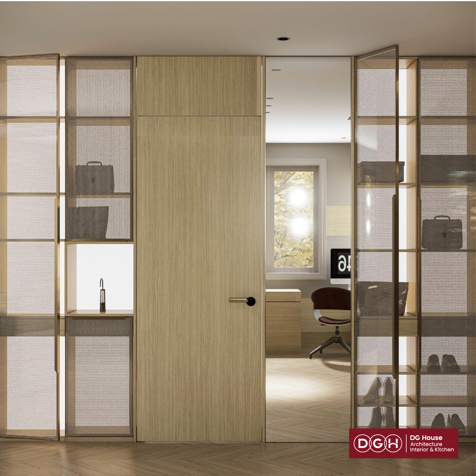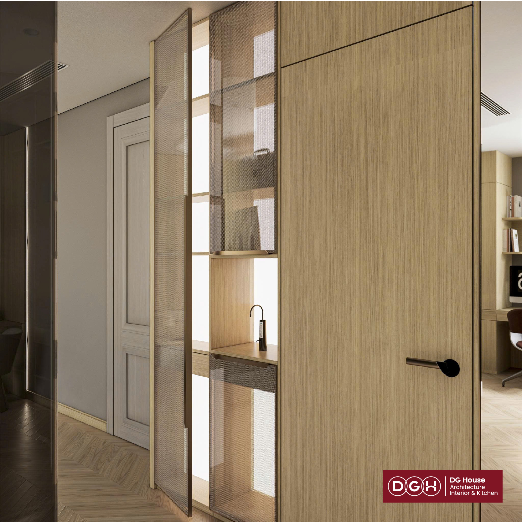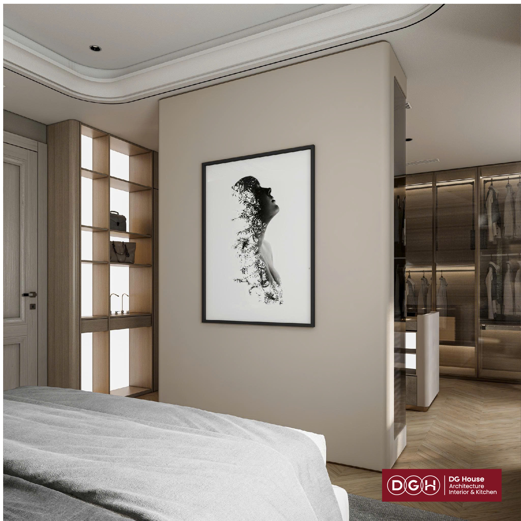 Điểm đắt giá nhất trong căn phòng của Mr. Long là hệ tủ quần áo cánh kính kịch trần. Việc sử dụng kính không chỉ giúp không gian trông rộng rãi hơn mà còn khoe trọn bộ đồ cưới của gia chủ thông qua hệ đèn LED cảm ứng chạy dọc các ngăn tủ.