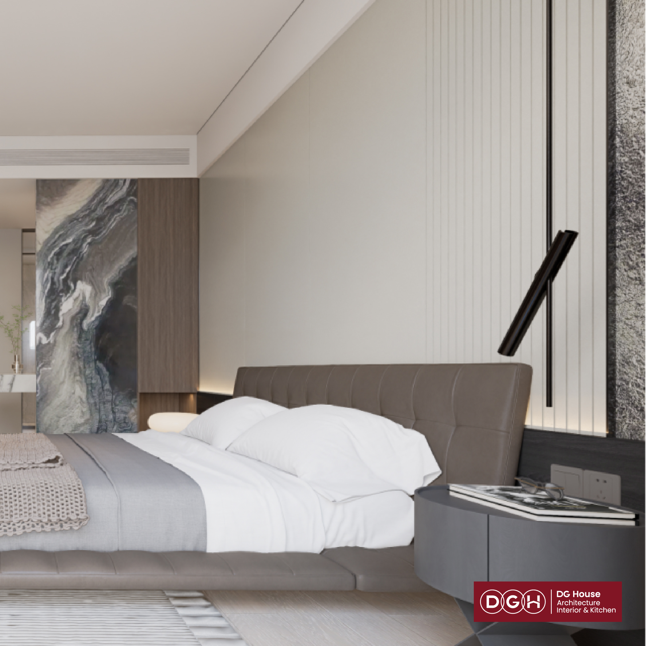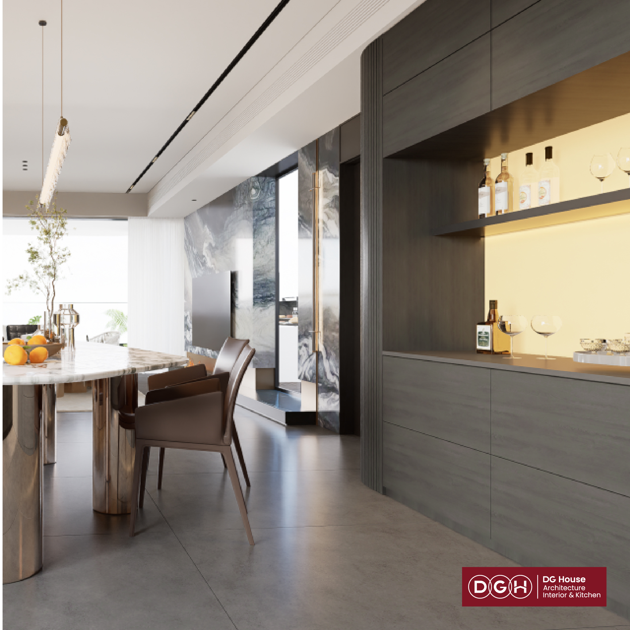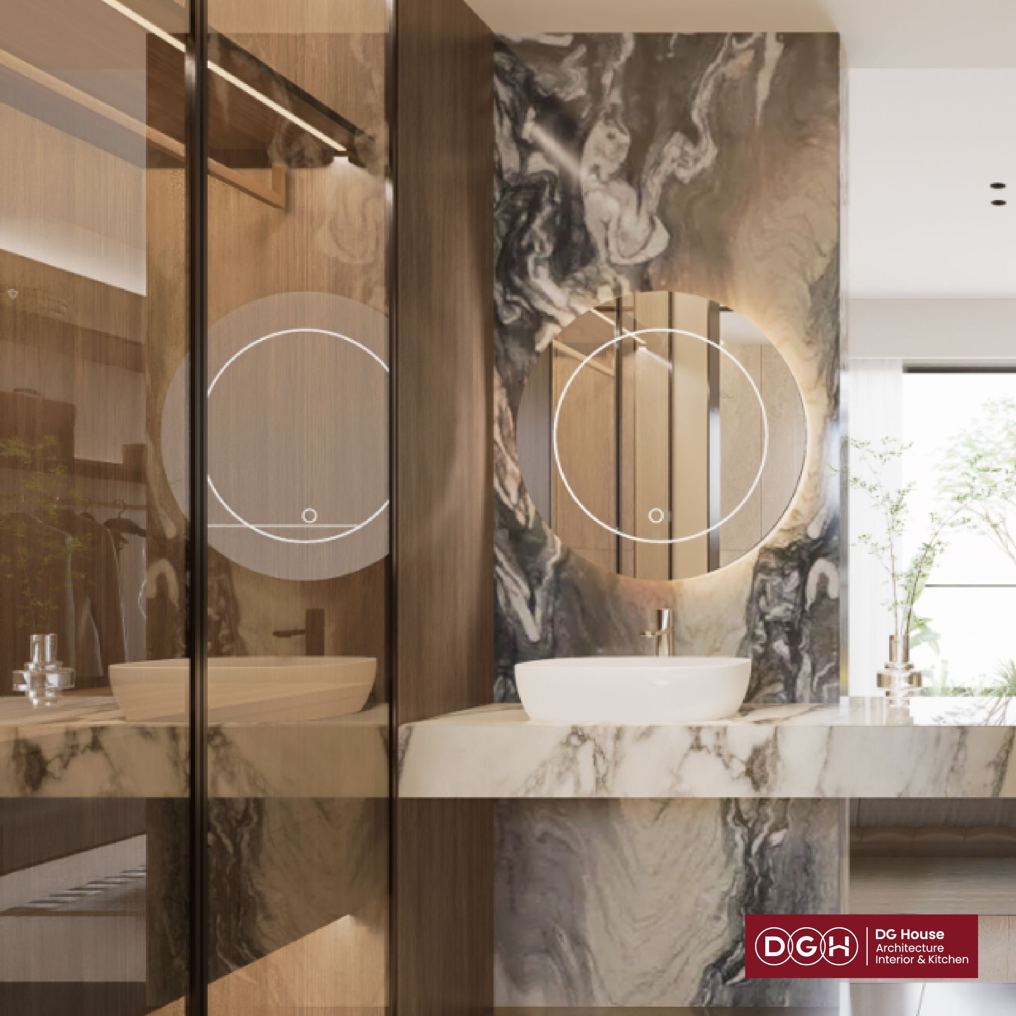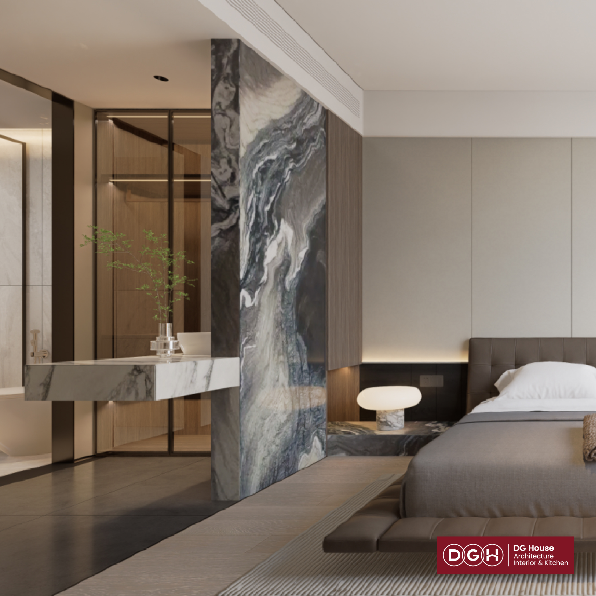 Chất liệu cao cấp như đá tự nhiên vân lớn, kim loại, kính, da… tạo cảm giác sang trọng và bền vững.