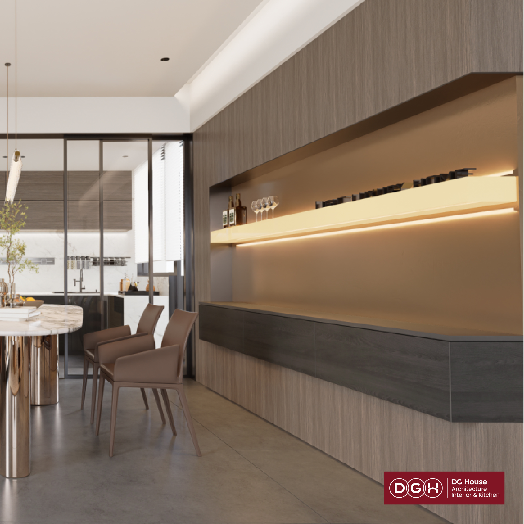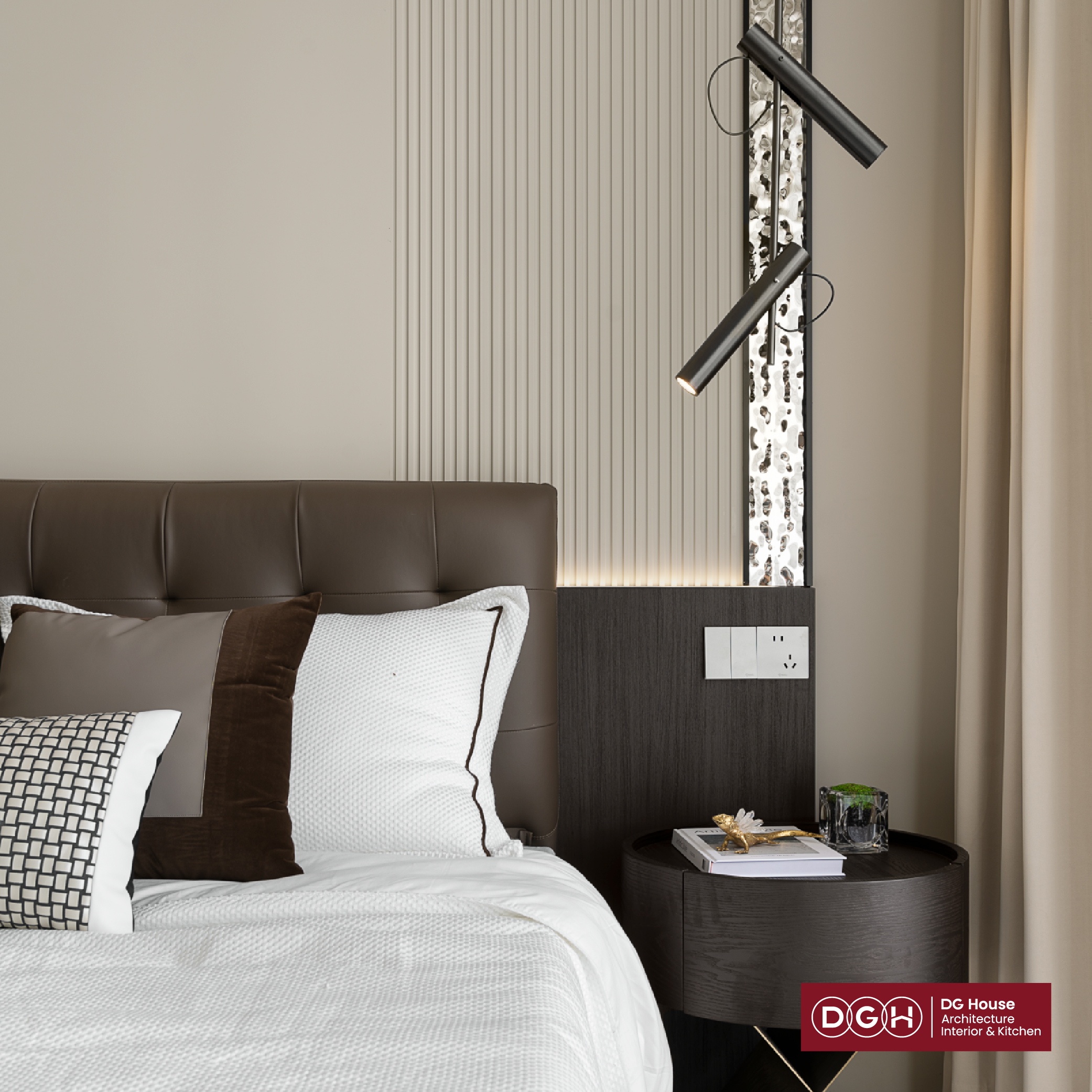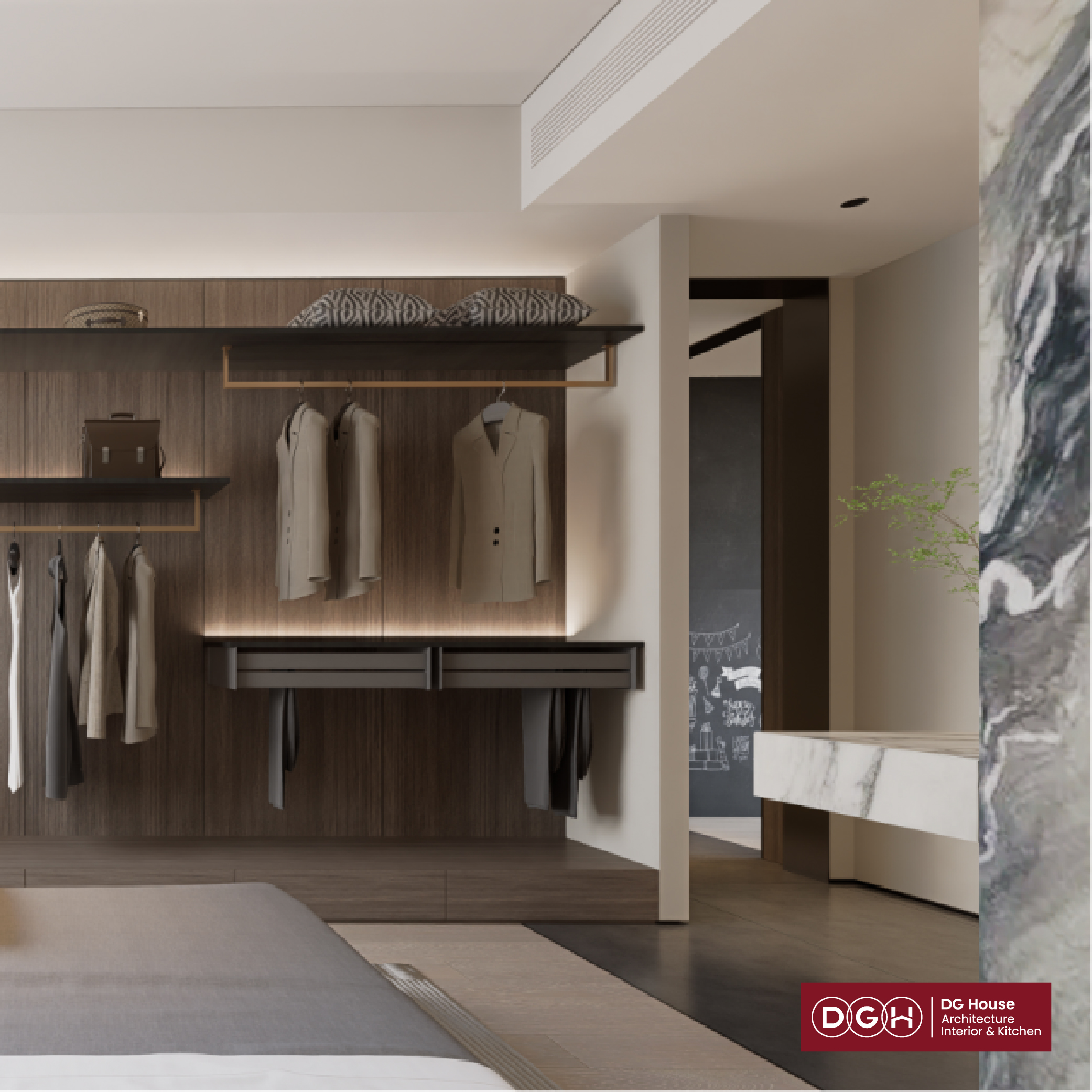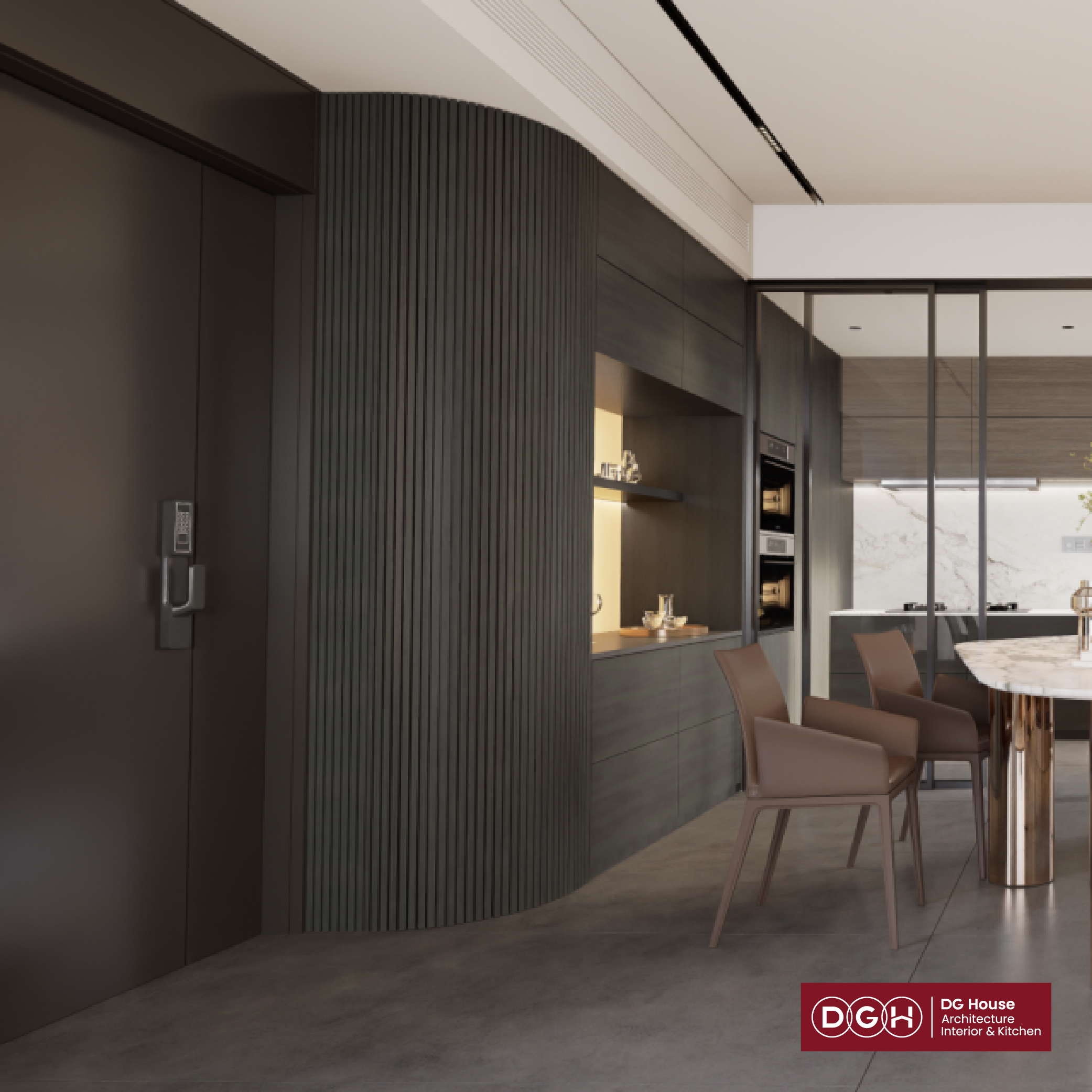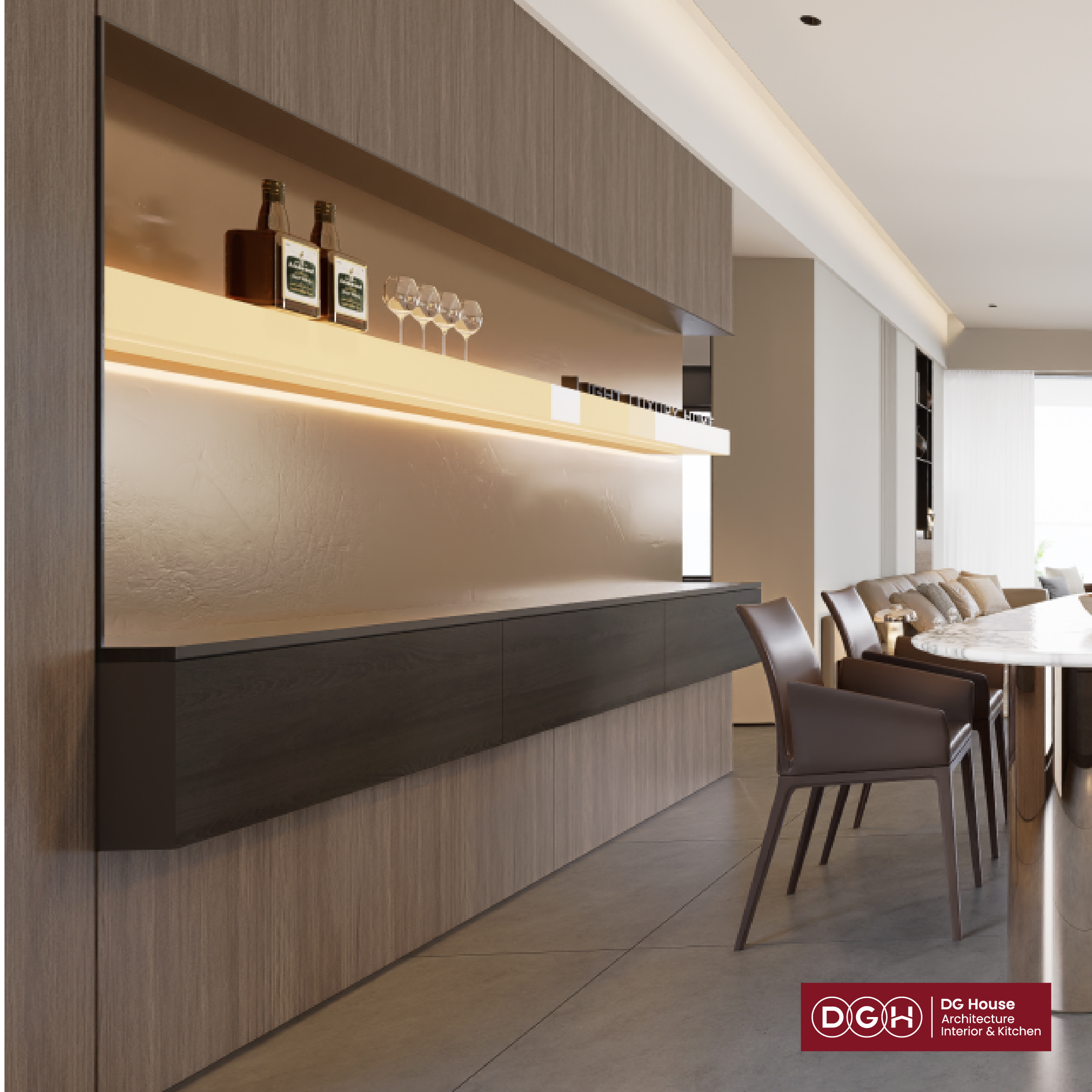 Chất liệu cao cấp như đá tự nhiên vân lớn, kim loại, kính, da… tạo cảm giác sang trọng và bền vững.