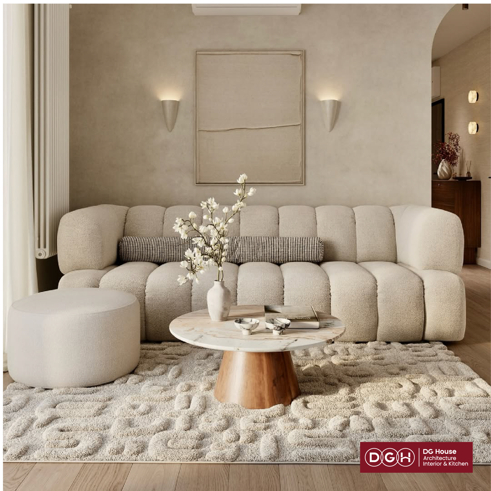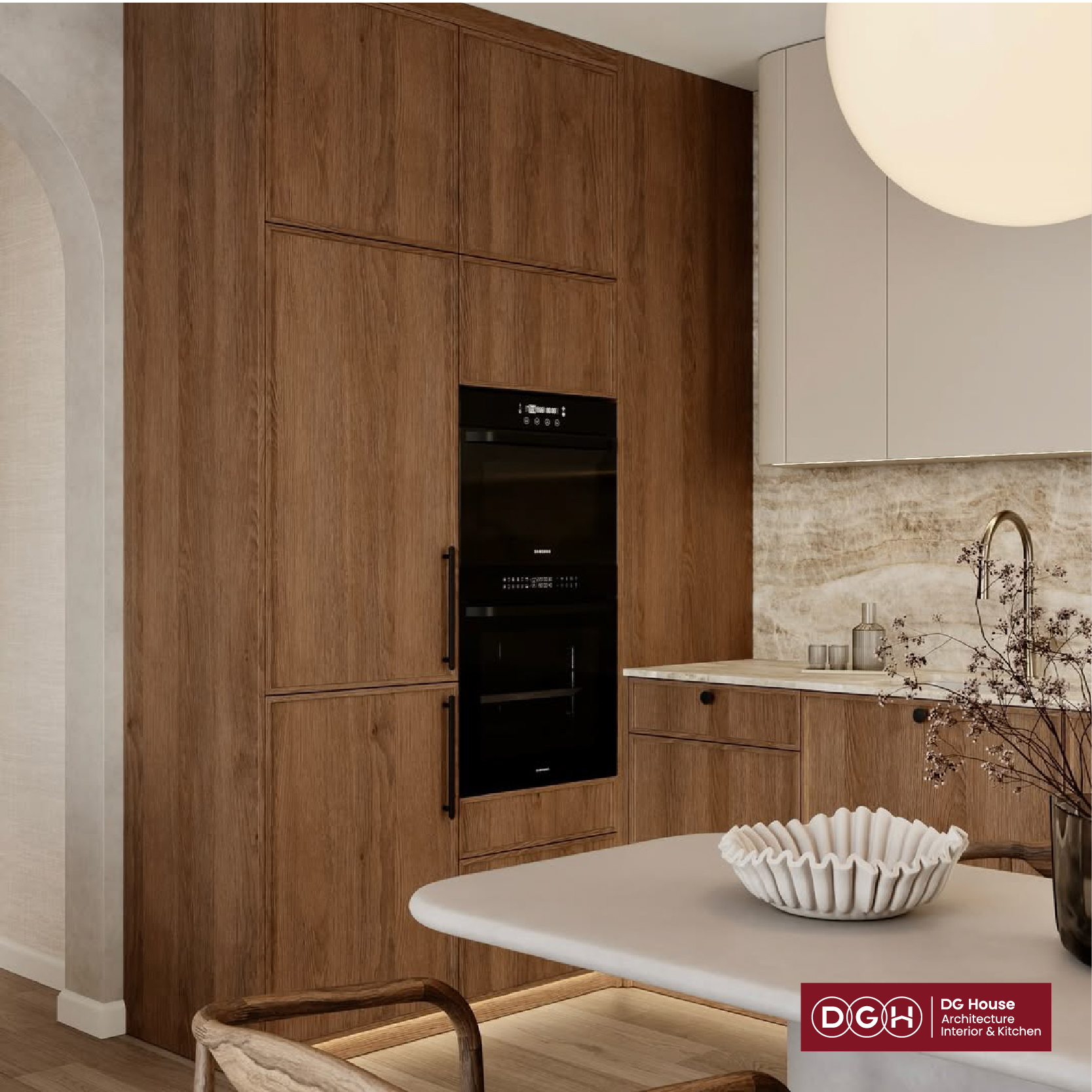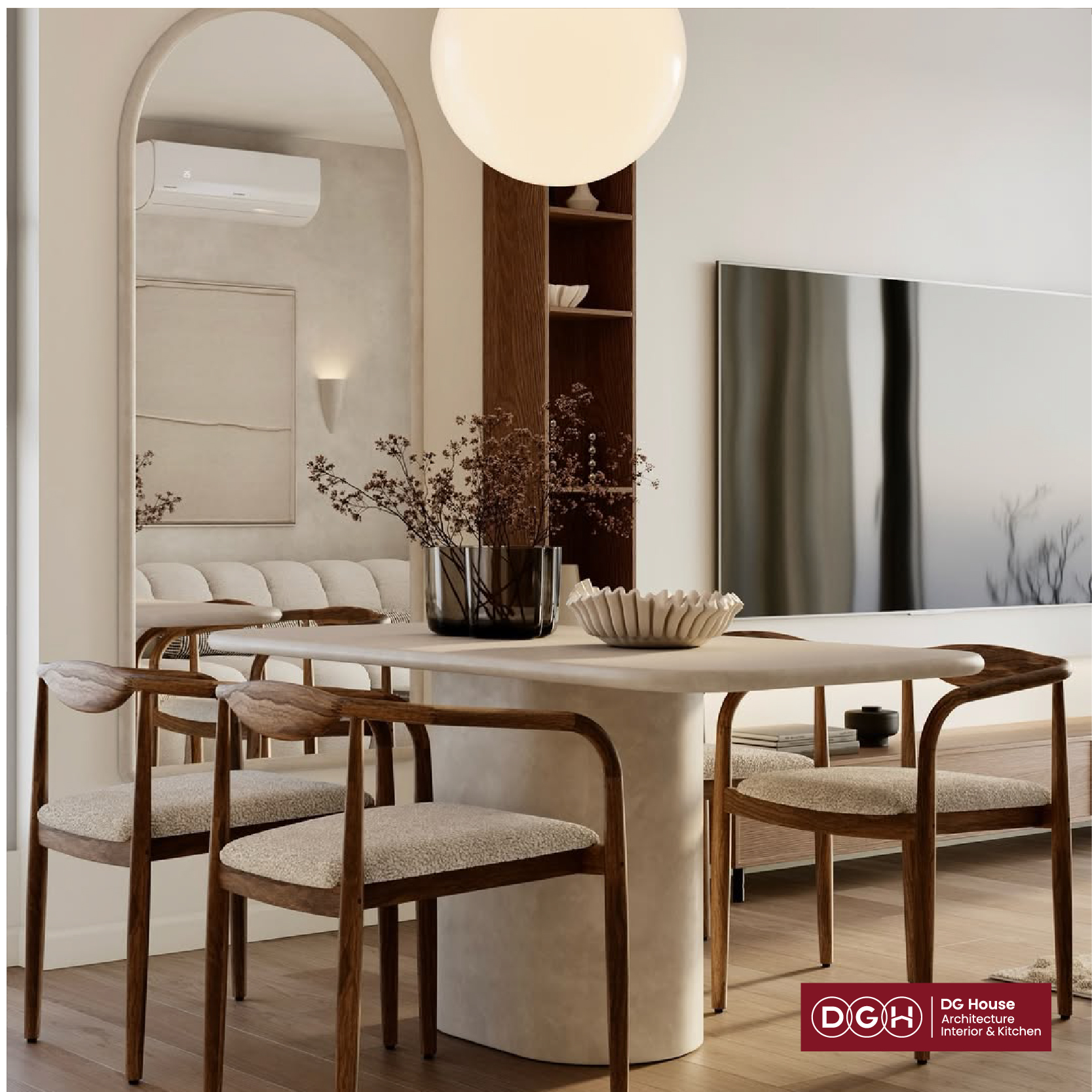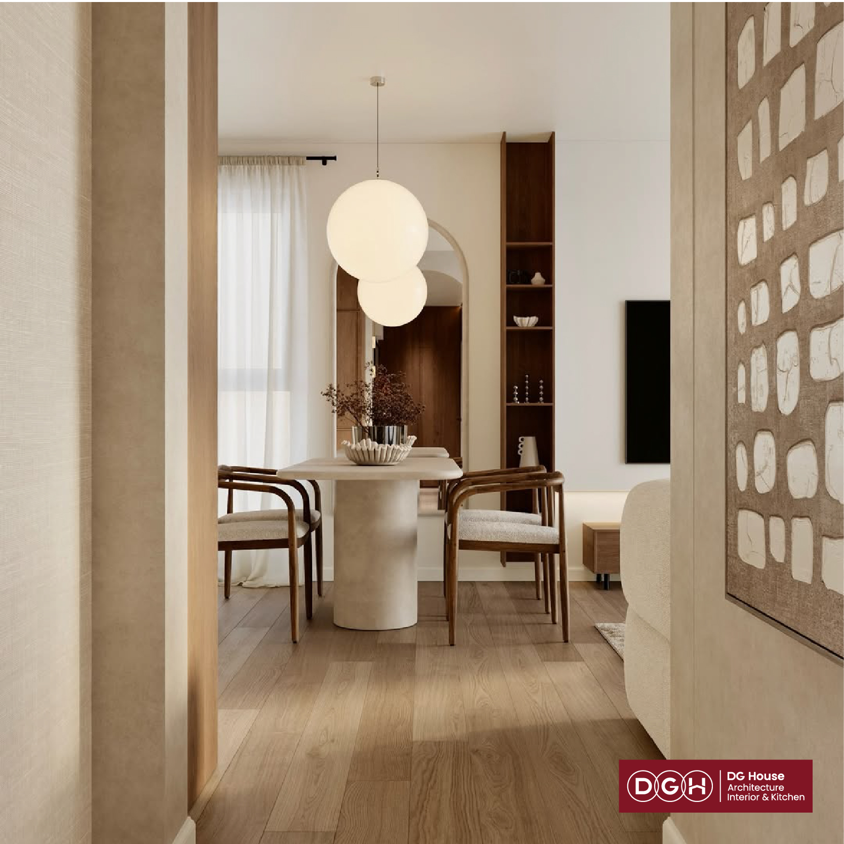 Đường nét vòm: Thay vì những góc cạnh cứng nhắc, hệ cửa vòm và cạnh bàn bo tròn giúp không gian trở nên uyển chuyển và rộng rãi hơn thực tế.