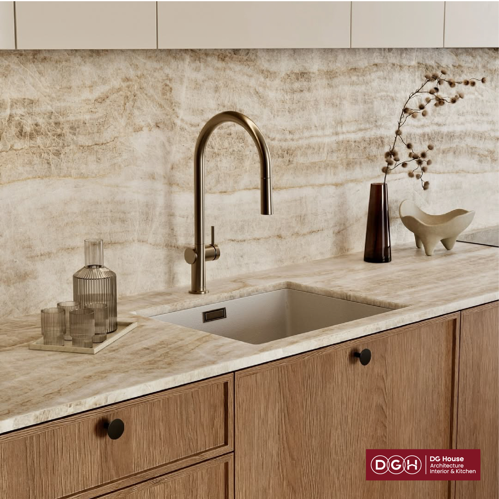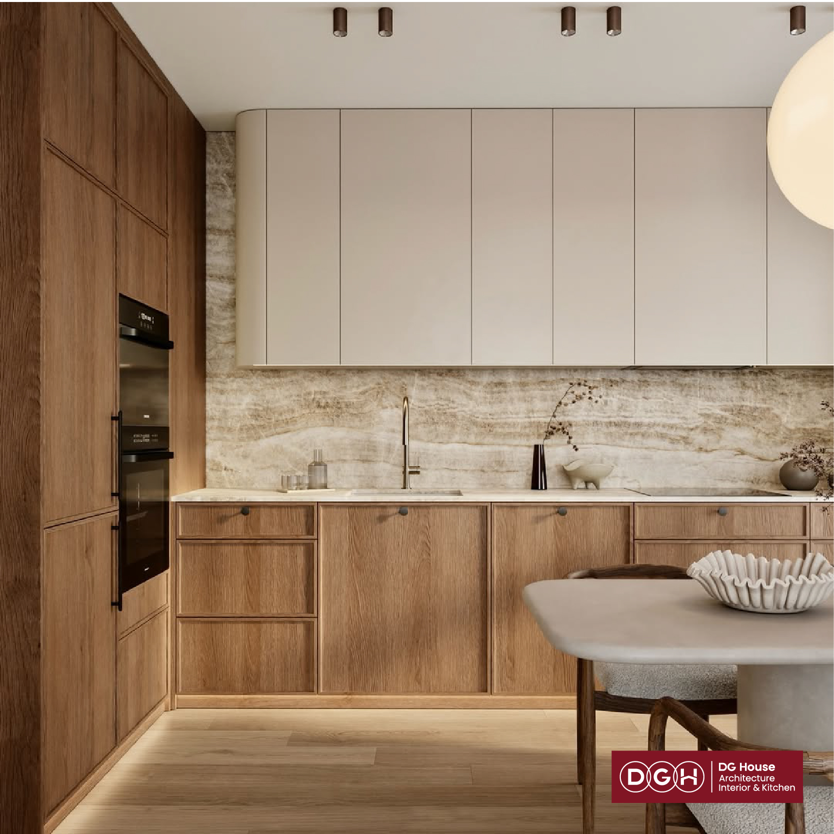 Sự đối lập thú vị: Sự lạnh lùng, sắc sảo của đá marble kết hợp với sự nồng ấm, mộc mạc của gỗ tạo nên một tổng thể cân bằng về thị giác.