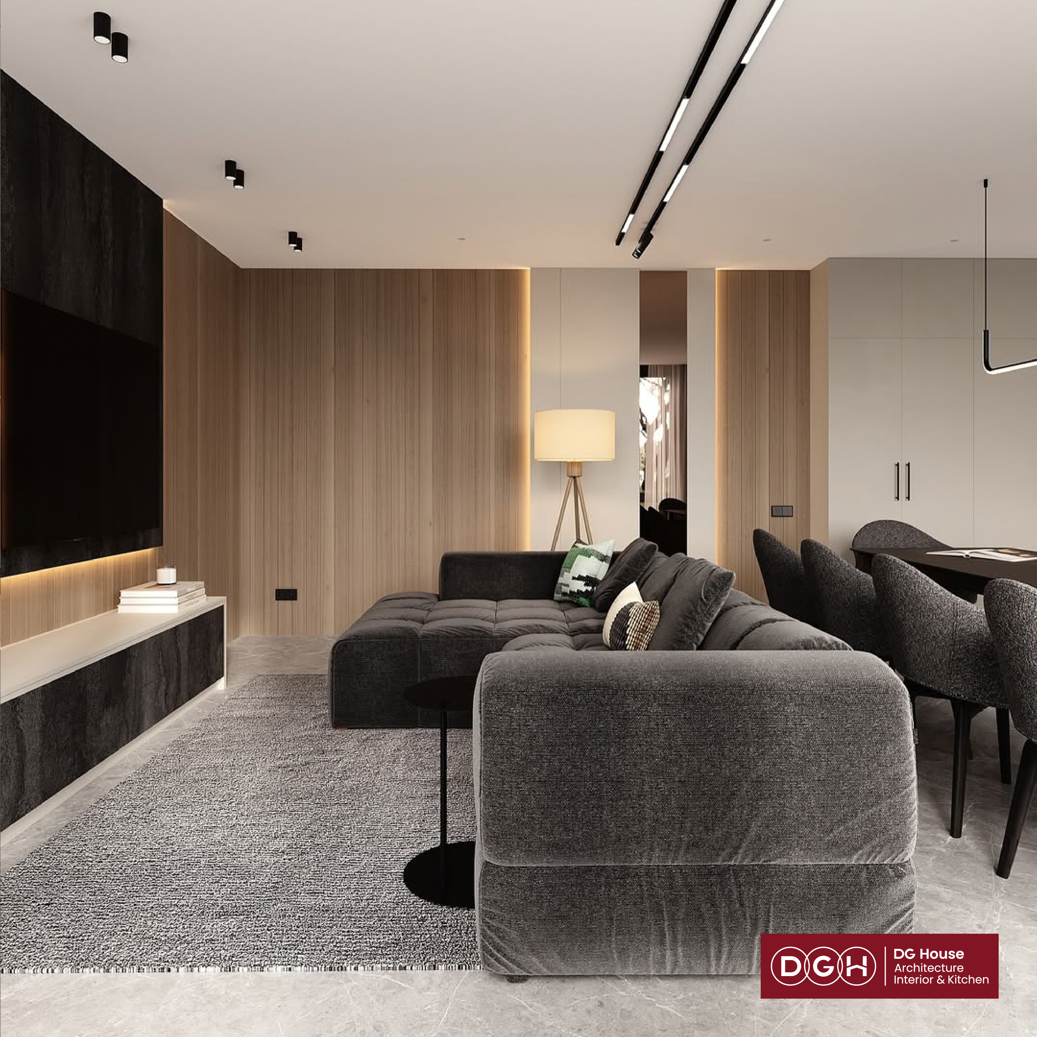 Điểm nhấn chất liệu: Những mảng tường ốp gỗ và nội thất bọc vải tweed cao cấp tạo nên chiều sâu thị giác.